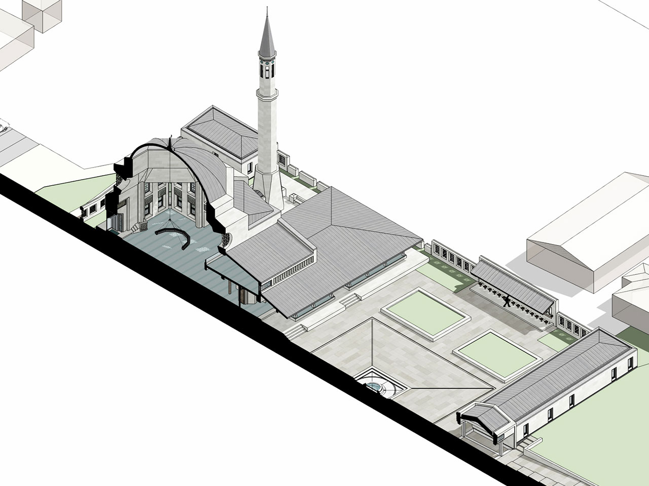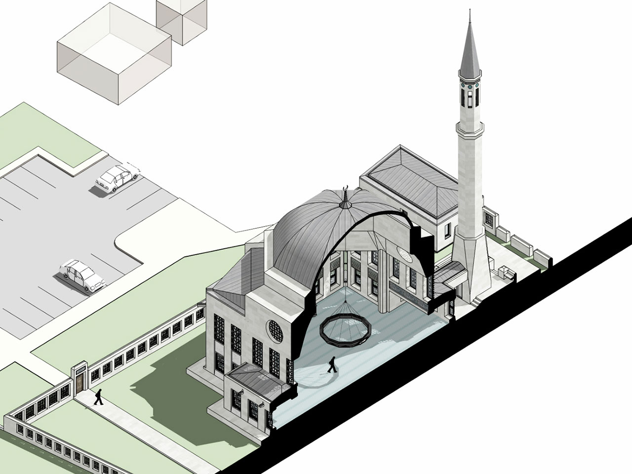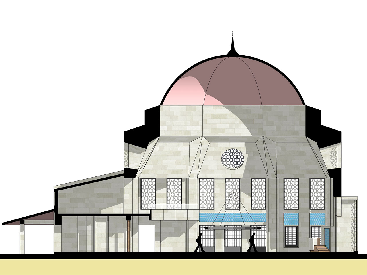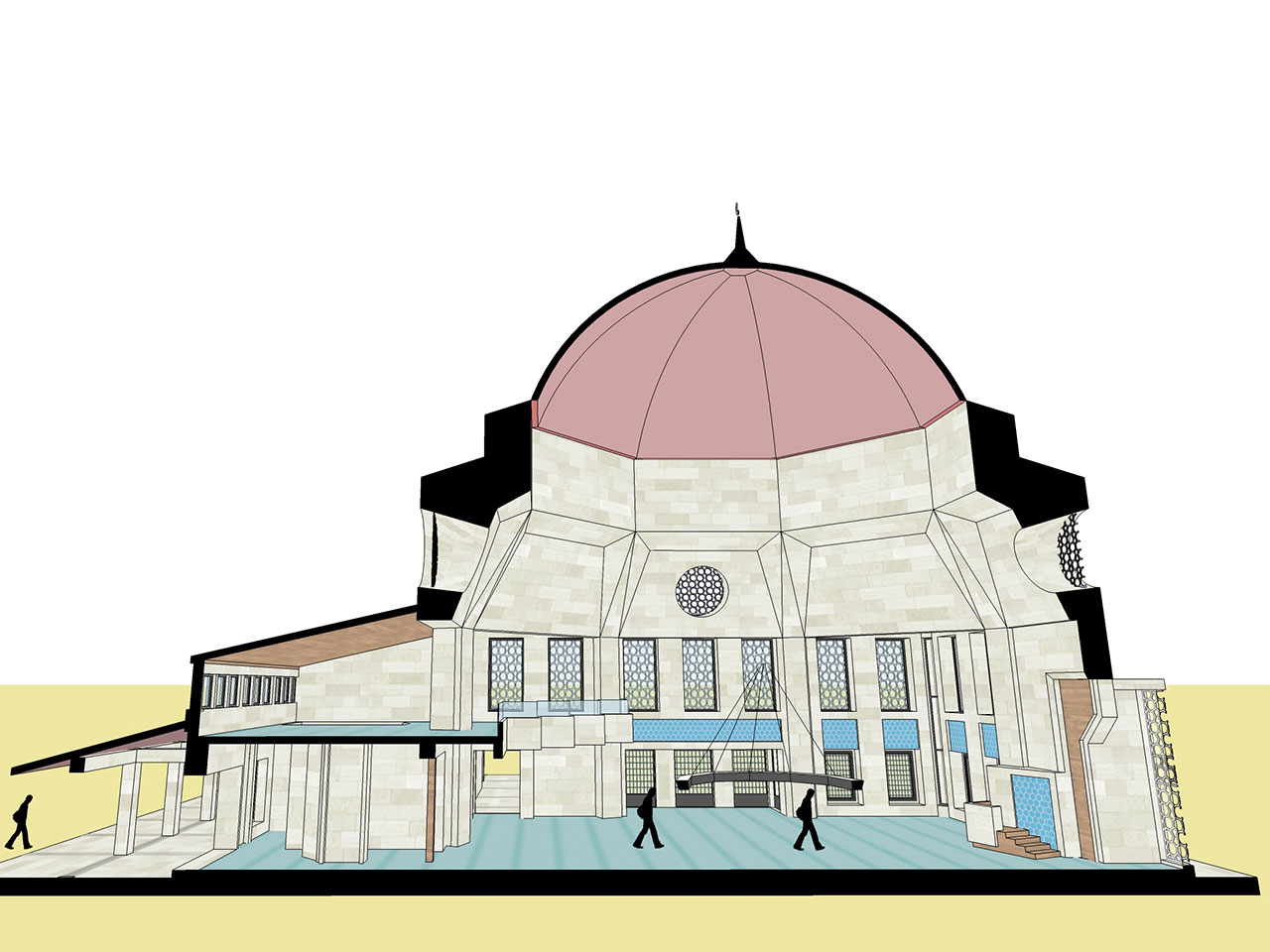 Merkezî planlı ana mekân sekizgen ayaklar üzerinde yükselir, bu ayaklar beden duvarı seviyesinden sonra içeri kıvrılarak sekizgen bir kasnak oluşturur. Bu sekizgen kasnak üzerine dilimli bir kubbe oturur. Ana yapıyı oluşturan bu sekiz kolon iç mekânda hissedilir, ancak mekânı bölmeden duvarların içinde gizlenir. Proje inşaat aşamasındadır.