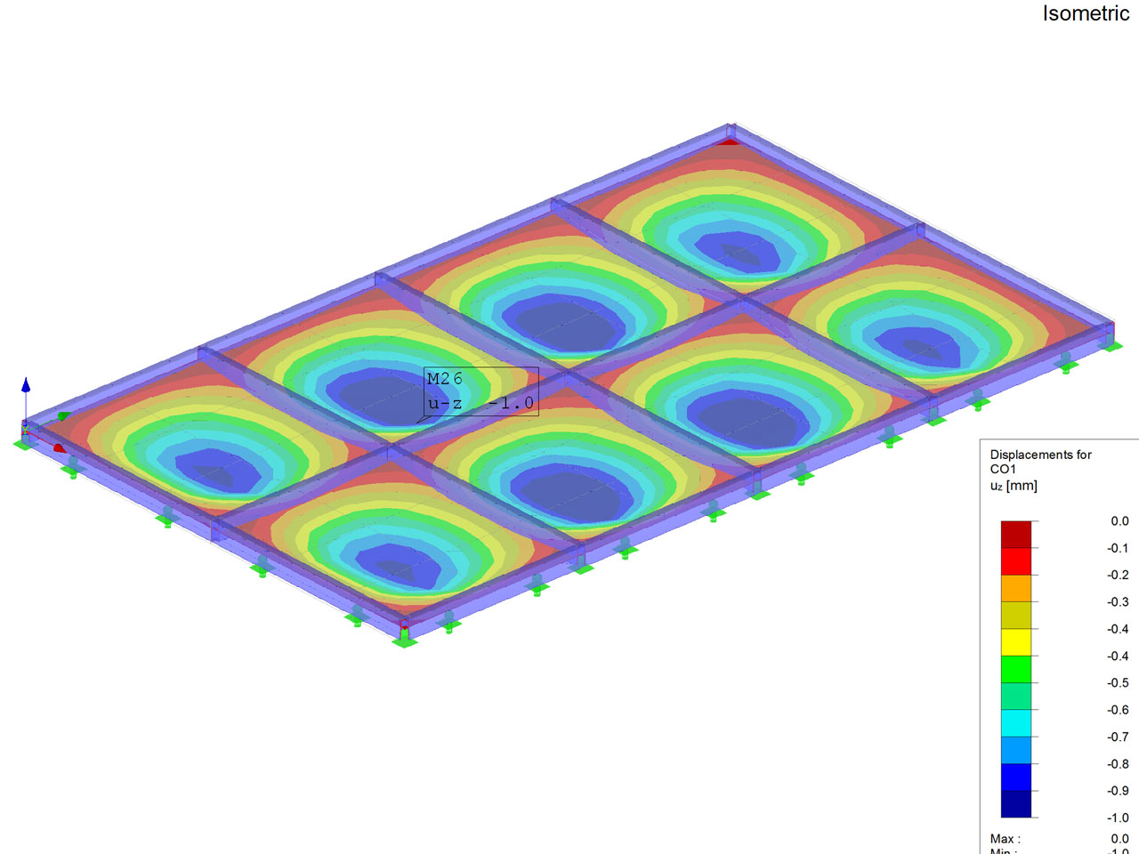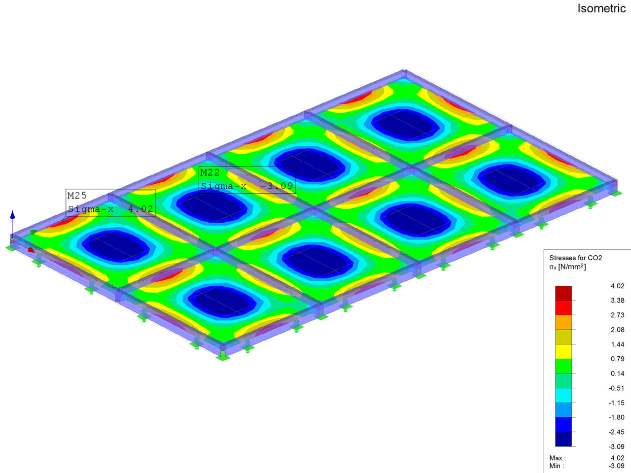 - Hizmetler : Döşeme için DIN EN 13474, DIN 18008-1:2010-12 yönetmeliklerine göre Lamine Cam Statik Sonlu Elemanlar Analizi (FEM),